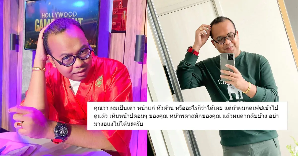 คุณว่า ผมเป็นเต่า หน้าแก่ หัวล้าน หรืออะไรก็ว่าได้เลย แต่ถ้าผมกดเฟซเข้าไปดูแล้ว เห็นหน้าปลอมๆ ของคุณ หน้าพลาสติกของคุณ แล้วผมด่ากลับบ้าง อย่ามางอแงไม่ได้นะครับ