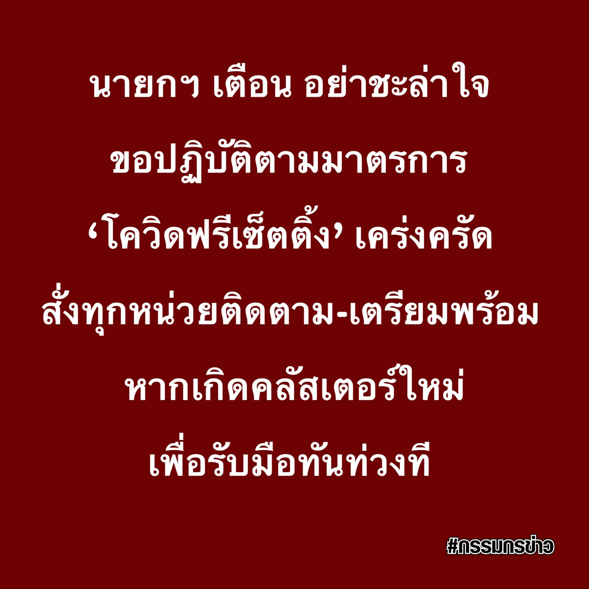 นายกฯ เตือน อย่าชะล่าใจ ขอปฏิบัติตามมาตรการโควิดฟรีเซ็ตติ้งเคร่งครัด สั่งทุกหน่วยติดตาม-เตรียมพร้อม หากเกิดคลัสเตอร์ใหม่ เพื่อรับมือทันท่วงที
