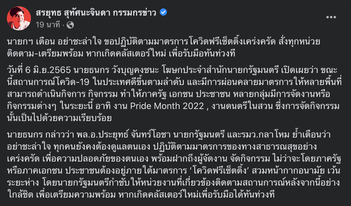 ล่าสุด 06 มิ.ย. 65 เพจ สรยุทธ สุทัศนะจินดา กรรมกรข่าว ก็ได้ออกมาให้ข้อมูลเกี่ยวกับความห่วงใยของนายกรัฐมนตรี พลเอกประยุทธ์ จันทร์โอชา ที่มีต่อประชาชน โดยมีเนื้อหาว่า