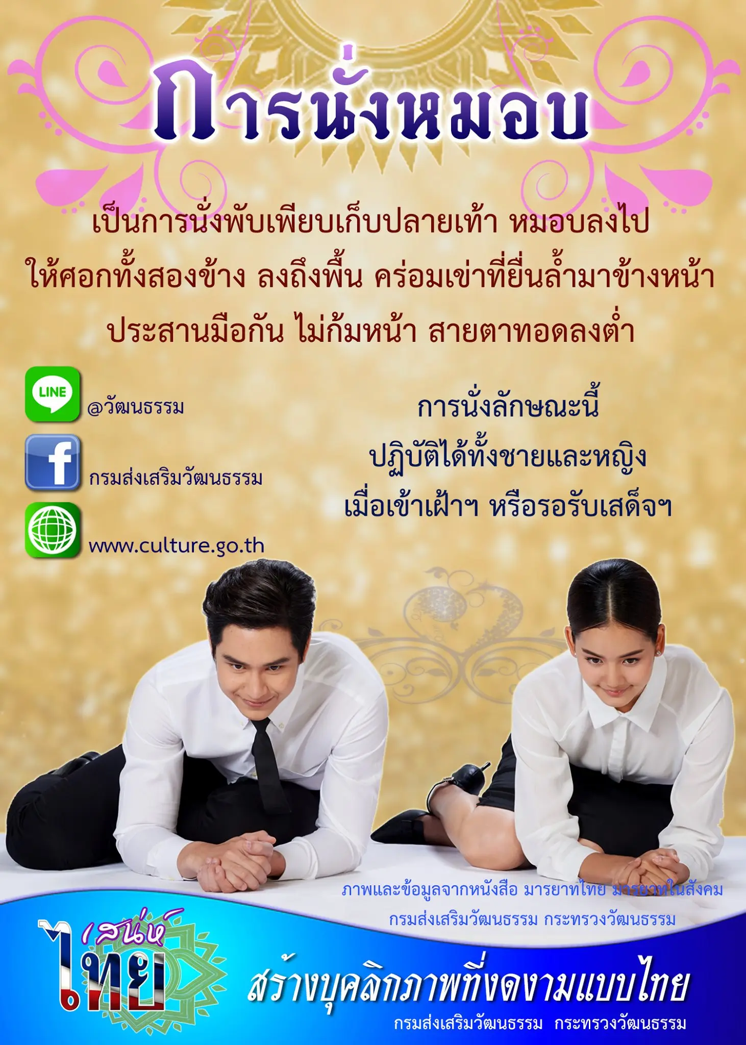 แต่อาจจะไม่ใช้ไม่ได้ในสมัยนี้ เพราะมีภาพที่เกิดเป็นกระแสกระฮึ่มโลกโซเชียลอย่างแพร่หลาย กับภาพจากเพจดังอย่าง กรมส่งเสริมวัฒนธรรม ที่ได้ทำการโพสต์ข้อความว่า มาสร้างบุคลิกภาพที่งดงามแบบไทยกันนะจ๊ะ “การนั่งหมอบ” #เสน่ห์ไทย #กรมส่งเสริมวัฒนธรรม