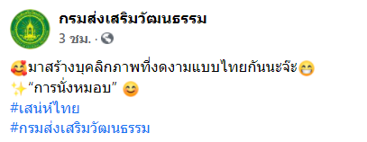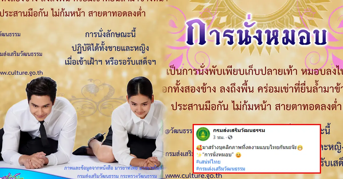 กรมส่งเสริมวัฒนธรรม — โพสต์ภาพ การนั่งหมอบ พร้อมใส่แฮชแท็กเสน่ห์ไทย ทัวร์ลงยับ! เจอถามร.5 เลิกหมอบกราบแล้วนะ รู้ยัง?