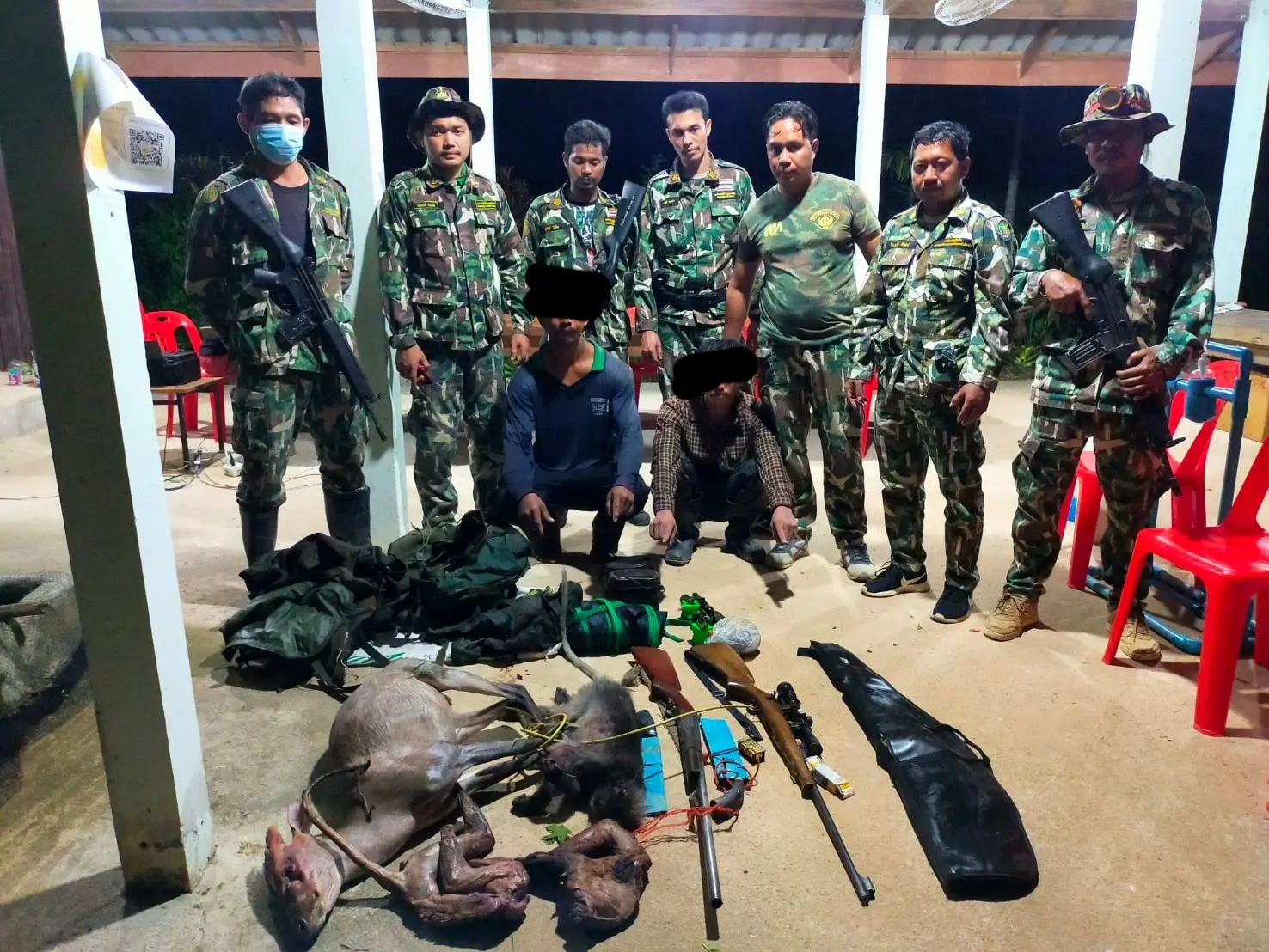 เจ้าหน้าที่เขตรักษาพันธุ์สัตว์ป่า อุทยาน จ.ชุมพร รวบ 2 คนร้าย พร้อมของกลาง ซากสัตว์ป่าคุ้มครอง และอาวุธปืนส่ง สภ.สลุย ดำเนินคดีตามกฎหมาย