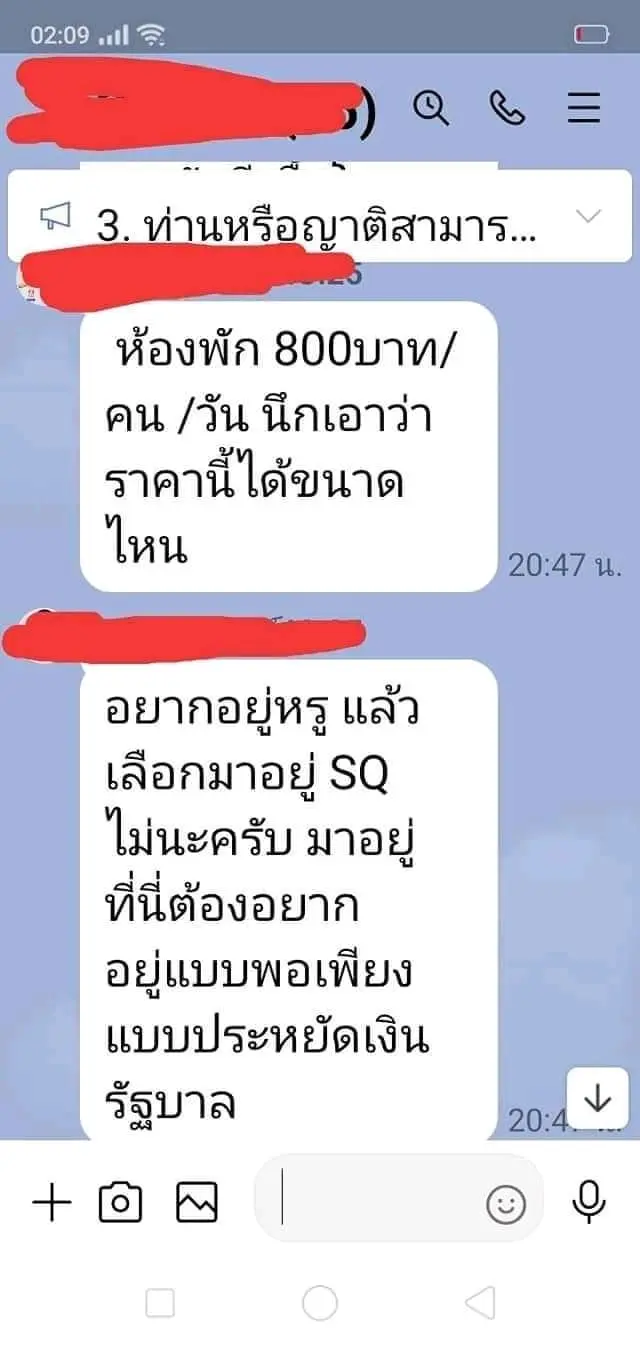ทำให้เกิดความไม่พอใจกับผู้เข้าพักกักตัว ซึ่งไม่ใช้แค่วันเดียวที่เกิดเหคุการณ์แบบนี้ บางวันเจอผลเน่า แต่หลังกลับไม่มีใครร้องเรียนอะไร เพราะกลัวมีปัญหา และยังบอกอีกว่า สำหรับเรา10วัน คือการปฎิบัติธรรมค่ะ ไม่มีอะไรได้ดังใจทุกอย่าง แม้แต่ความสะอาดของอาหารเพราะเขาบอก มาตรฐานของเขาคือ ร้านอาหารตามสั่ง หากย้อนกลับไปได้จะเลือกกักตัวแบบจ่ายเงินเอง