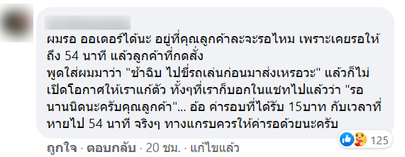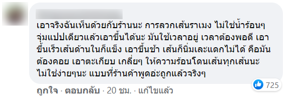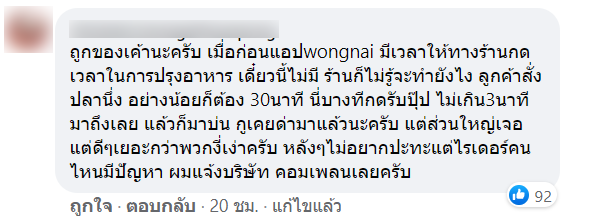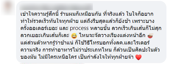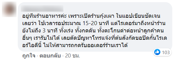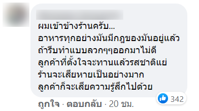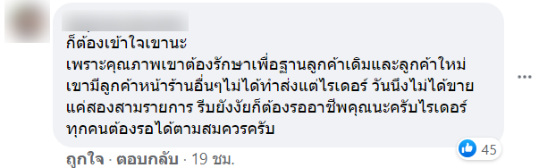 หลังจากที่ทางเพจโพสต์ลง ก็ได้มีคนเข้ามาแสดงความคิดเห็นจำนวนมาก บ้างก็เข้าข้างร้าน บ้างก็คิดว่าไม่ควรโทษไรเดอร์ควรโทษลูกค้าที่มาเร่ง บ้างก็คิดว่าร้านเหยียดร้านอื่น ๆ จนทำให้มีคนเข้าไปคอมเมนท์ มากถึง 1,200 กว่าคอมเมนท์เลยทีเดียว