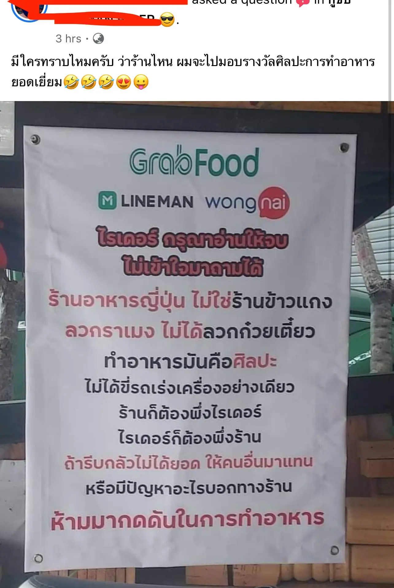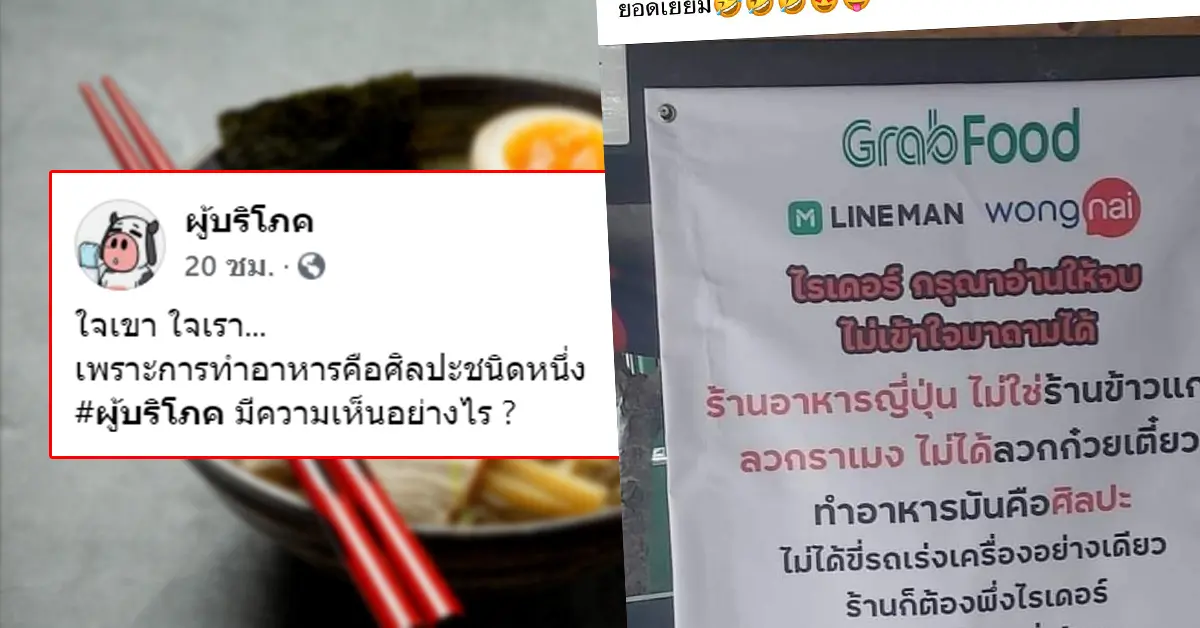 โดยเมื่อวันที่ 7 กรกฎาคม 2564 ได้มีผู้ใช้เฟซบุ๊กแฟนเพจ ชื่อว่า ผู้บริโภค โพสต์ภาพ ป้ายไวนิลหน้าร้านราเมงแห่งหนึ่ง โดยที่ในป้ายมีข้อความว่า “ไรเดอร์กรุณาอ่านให้จบ ไม่เข้าใจมาถามได้ ร้านอาหารญี่ปุ่น ไม่ใช่ร้านข้าวแกง ลวกราเมง ไม่ได้ลวกก๋วยเตี๋ยว ทำอาหารมันคือศิลปะ ไม่ได้ขี่รถเร่งเครื่องอย่างเดียว ร้านก็ต้องพึ่งไรเดอร์ ไรเดอร์ก็ต้องพึ่งร้าน ถ้ารีบกลัวไม่ได้ยอด ให้คนอื่นมาแทน หรือมีปัญหาอะไรบอกทางร้าน ห้ามมากดดันในการทำอาหาร“