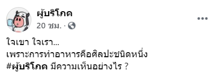 พร้อมกันนี้ทางเพจก็ได้ตั้งคำถามว่า ‘ใจเขา ใจเรา…เพราะการทำอาหารคือศิลปะชนิดหนึ่ง #ผู้บริโภค มีความเห็นอย่างไร ?’
