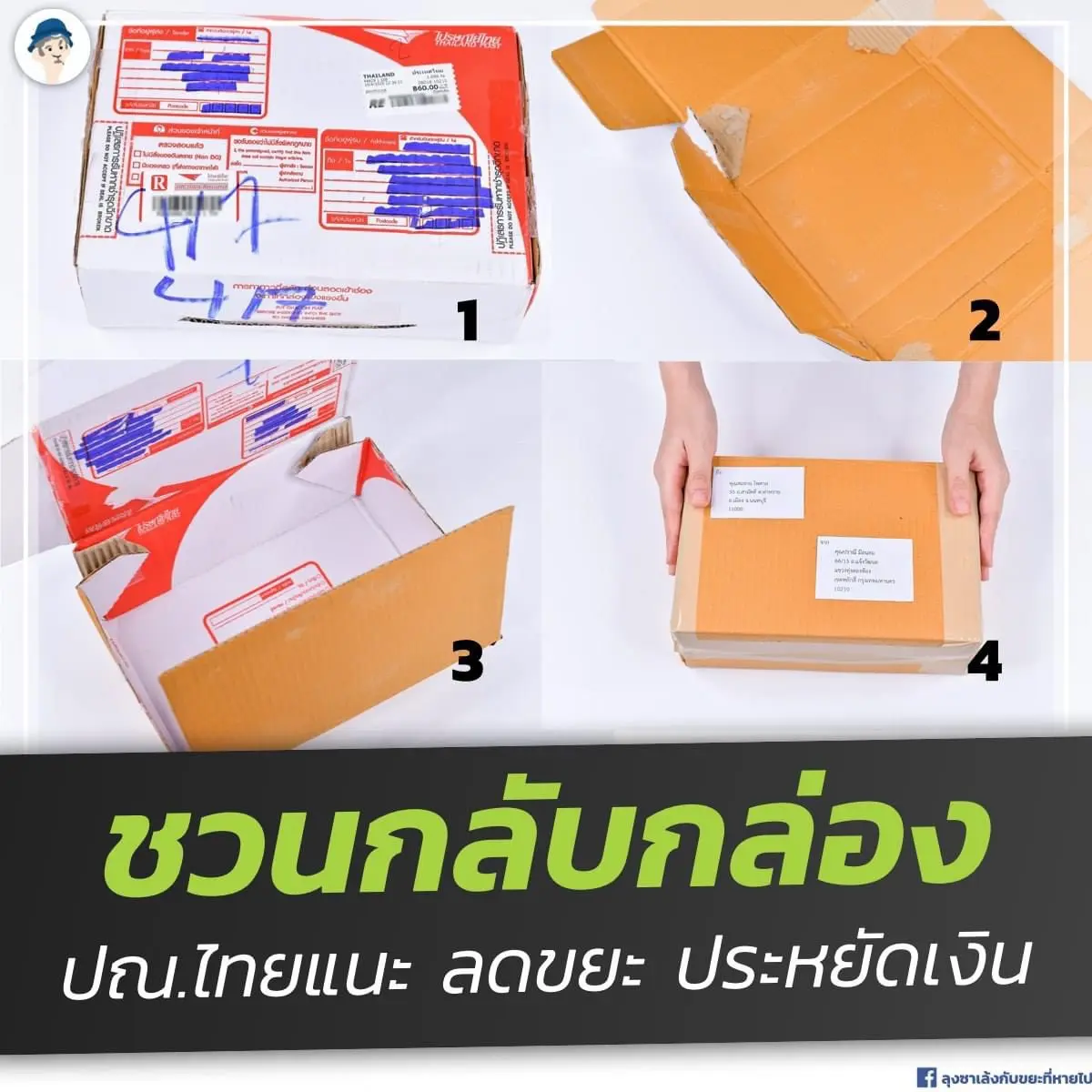 แต่เมื่อปริมาณการสั่งซื้อของออนไลน์ที่มากขึ้น ขยะที่มาจากกล่องพัสดุก็มากขึ้นตาม เพราะเมื่อแกะกล่องที่เราซื้อสินค้าเสร็จแล้วนั้น กล่องที่แกะไปเราจะสามารถนำไปใช้ประโยชน์อื่นได้อีกหรือไม่ ไปรษณีย์ไทยเล็งเห็นถึงความสำคัญในข้อนี้จึงได้แนะวิธีดีๆที่ชวนให้เหล่าขาช็อปได้นำไปลองใช้กัน ให้สามารถใช้ซ้ำได้อีกครั้ง โดยเพจเฟซบุ๊กอย่าง “ลุงซาเล้งกับขยะที่หายไป” ไปบนโลกออนไลน์ได้โพสต์ภาพวิธีการนำกล่องพัสดุเดิม มาReuse ใหม่อีกครั้ง ด้วย