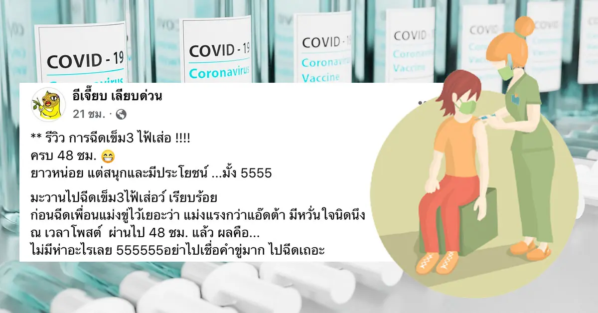 ไปฉีดซะ ไม่ต้องกลัว อีเจี๊ยบ เลียบด่วน รีวิว ไฟเซอร์ เข็ม3 โดนเพื่อนขู่ว่าแรง ลั่น ไปฉีดเถอะ ปกติ98% หัก2% ยอกแขนนิดๆ ขัดจรวดได้ ไม่ต้องกังวล