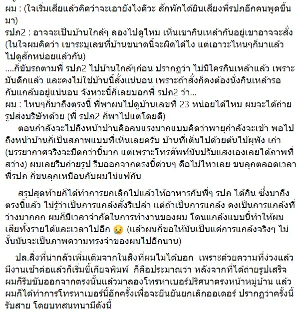 แต่พอมาถึงบอกบ้านเลขที่ 74/23 กับรปภ. ไป รปภ.กลับหน้าเสีย แล้วถามตนว่าผิดบ้านหรือเปล่า เพราะบ้านนี้เป็นบ้านร้างนะ จะมีคนสั่งของได้อย่างไร พอลองโทรหาลูกค้าก็ถูกตัดสายถึง 3 ครั้ง รปภ.จึงบอกว่าบ้านหลังนี้เขาติดหนี้ธนาคารและเจ้าของบ้านฆ่าตัวตายในบ้าน แถมยังยิงคนสวนที่เป็นคนลาวตายด้วย พอได้ฟังตนก็เริ่มใจเริ่มเสีย รปภ.อีกคนจึงพูดว่าอาจจะเป็นของบ้านข้าง ๆ เพราะเห็นกินเหล้ากันอยู่ จะไปดูหรือไม่