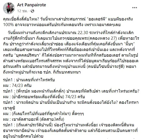 เรื่องราวสุดหลอนนี้เกิดขึ้นกับผู้ใช้เฟซบุ๊กชื่อว่า Art Panpairote ที่เจ้าตัวได้โพสต์เรื่องราวการไปส่งออเดอร์ผีลงในกลุ่ม กูขับpanda โดยระบุว่า เมื่อเวลาประมาณ 22.30 ตนใกล้จะเลิกงานแต่เกิดหิวขึ้นมา เลยแวะไปร้านยำแห่งหนึ่ง แต่พอใกล้ถึงตนก็ได้รับออเดอร์เข้ามาจากร้านยำร้านหนึ่ง จึงต้องไปรับอาหารและมาส่งตามที่คนสั่งได้บอกไว้ในแชท