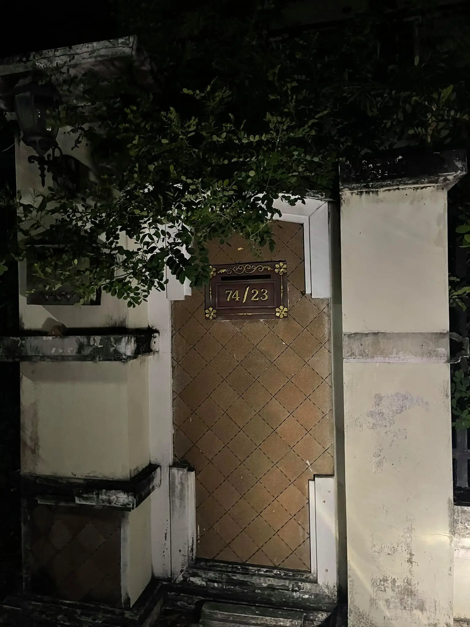 หลังจากนั้นรปภ.จึงขับรถนำเข้าไปที่บ้านหลังดังกล่าว ปรากฏว่าไม่มีใครกินเหล้ากันแล้ว ตนจึงคิดว่าไม่ใช่บ้านหลังนี้ เพราะถ้าใช่คงต้องรอกินกับแกลมแน่นอน ตนจึงบอกไปว่า ขอไปที่บ้าน 74/23 ได้ไหม จะได้ถ่ายรูปส่งบริษัท พอไปถึงก็สภาพเป็นแบบที่เห็นตามรูป บ้านเก่า ๆ ต้นไม้เยอะ ๆ ตนเลยรีบถ่ายรูปแล้วรีบออกมาทันที ด้วยอาการขนลุกสุดตัว