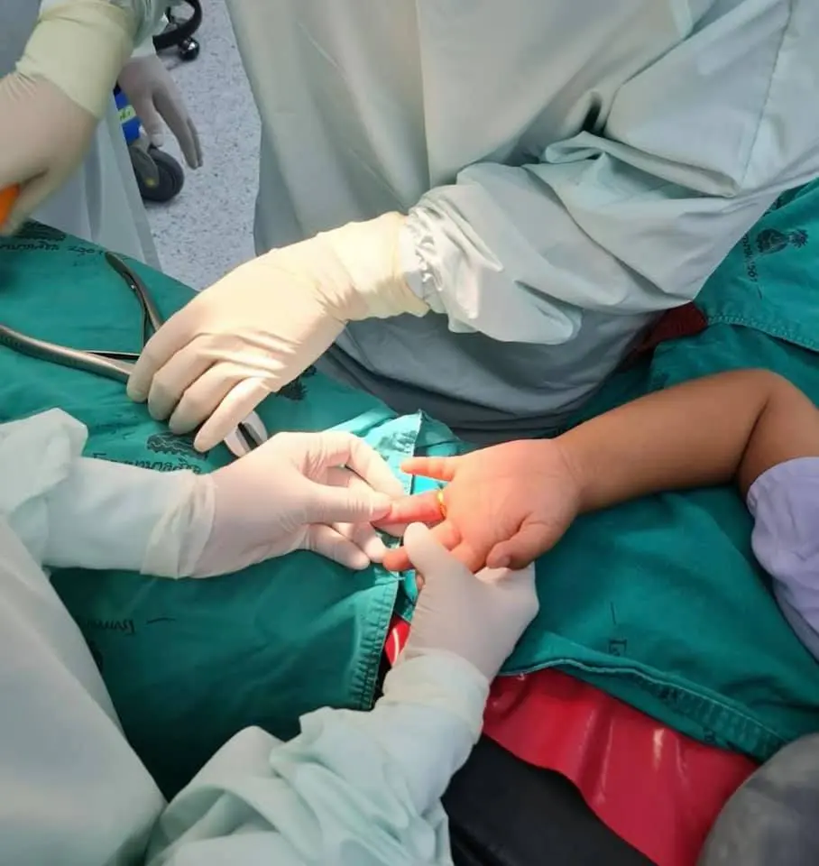แพทย์ พยาบาล ห้องฉุกเฉิน เดินเข้าไปตรวจอาการเด็ก พอเดินเข้าไปใกล้ๆ เด็กก็ร้องให้ ไม่ให้จับที่นิ้วแล้ว จึงปรึกษาแพทย์ดมยาสลบ และแพทย์ด้านกระดูก ส่งเข้าห้องผ่าตัด โดยให้มีการตรวจโควิด19แบบเร่งด่วนก่อน ผลเป็นลบ จึงเข้าห้องผ่าตัดทันที แต่ยังต้องใส่ชุดป้องกันระดับ2