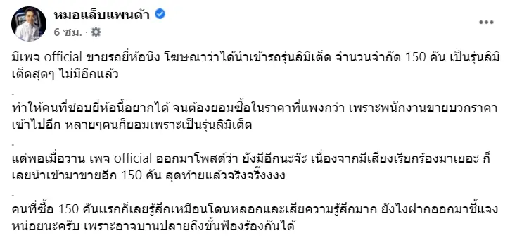 หมอแล็บแพนด้า เพจคุณหมอชื่อดัง โพสต์เฟซบุ๊ก ถึงเพจ ขายรถ ยี่ห้อหนึ่ง กรณีแจ้งลูกค้าเปิดจองรถรุ่นมีจำนวนจำกัดแต่เปิดขายอีกรอบ แนะออกมาชี้แจงลูกค้า
