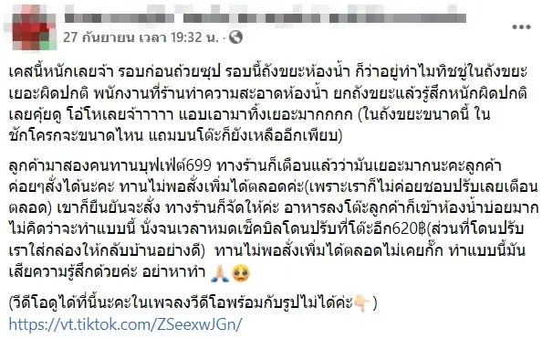 เมื่อวันที่ 27 ก.ย. ที่ผ่าน เฟวบุ๊กเพจของร้านอาหารญี่ปุ่นแห่งหนึ่งในจังหวัดสุราษฎร์ธานี ได้โพสต์ข้อความหลังจากที่พบเจอกับประสบการณ์ที่ทำเอาเจ้าของร้านถึงกับต้องเสียความรู้สึกเพราะลูกค้าได้นำอาหารที่ทานไม่หมด ห่อทิชชู่ไปทิ้งในห้องน้ำ โดยทางร้านได้ระบุเอาไว้ว่า