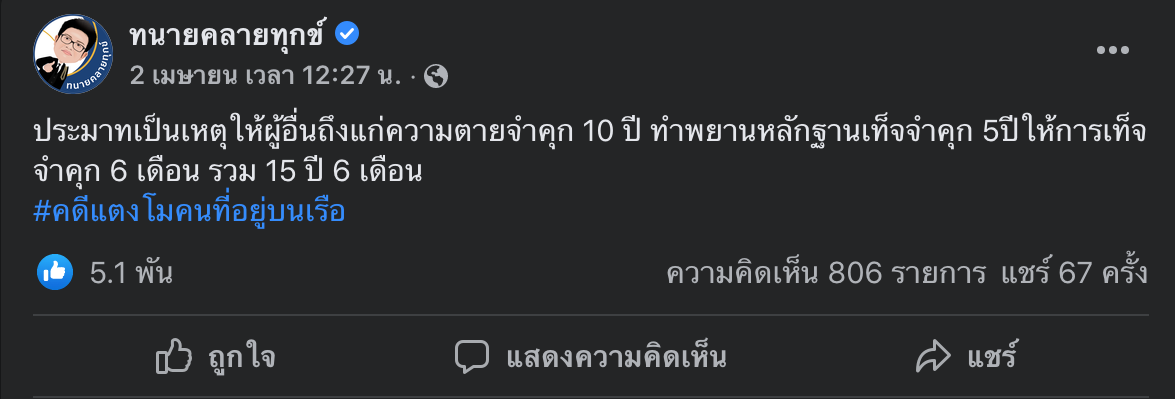 “ประมาทเป็นเหตุให้ผู้อื่นถึงแก่ความตายจำคุก 10 ปี ทำพยานหลักฐานเท็จจำคุก 5ปี ให้การเท็จจำคุก 6 เดือน รวม 15 ปี 6 เดือน #คดีแตงโมคนที่อยู่บนเรือ”