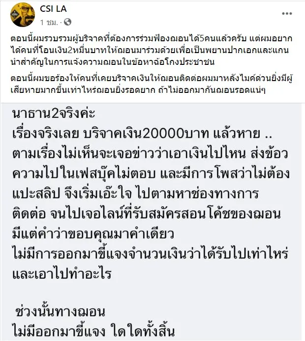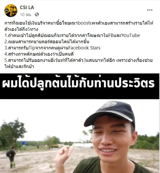 ล่าสุดทางด้านเพจ CSI LA ก็ได้ออกมาโพสต์ข้อความเพื่อรวบรสมพยานและหลักฐานของผู้ที่เคยโอนเงินเข้ายังบัญชีฌอนในการช่วยเหลือไฟป่าเพื่อแจ้งข้อหาฉ้อโกงประขาขนกับฌอน และจับพิรุธฌอนจากกรณีที่ว่านำเงินที่ได้รับบริจาคนั้นไปสร้างรายได้จาก boots โพสต์บนเฟซบุ๊ก จากโพสต์ปลูกต้นไม้กับประวิตร เนื่องจากโพสต์ดังกล่าวเมื่อมีการ Boots โพสต์ออกไป จะสามารถสร้างรายได้ให้กับตัวฌอนเอง