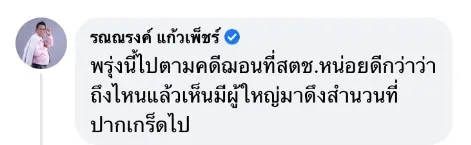“พรุ่งนี้ไปตามคดีฌอน ที่สตช.หน่อยดีกว่าว่าถึงไหนแล้วเห็นมีผู้ใหญ่มาดึงสำนวนที่ปากเกร็ดไป”