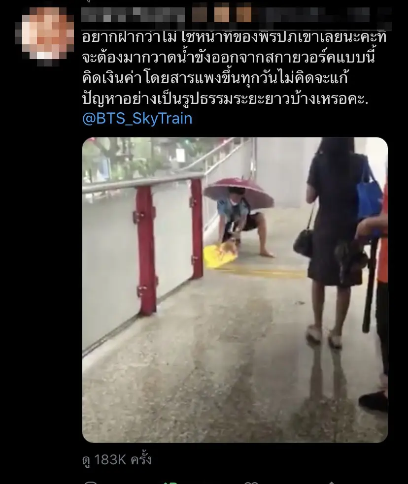 “อยากถามว่าไม่ใช่หน้าที่ของพี่รปภเขาเลยนะคะที่จะต้องมากวาดน้ำขังออกจากสกายวอล์คแบบนี้ คิดเงินค่าโดยสารแพงขึ้นทุกวันไม่คิดจะแก้ปัญหาอย่างเป็นรูปธรรมระยะบ้างเหรอคะ”