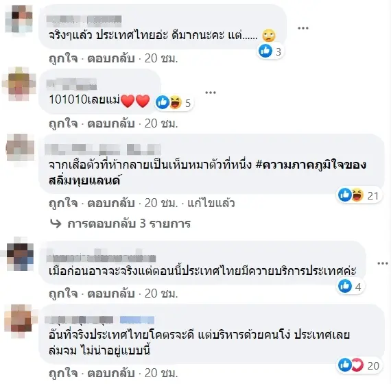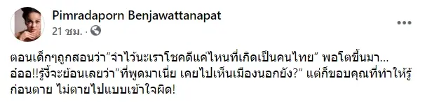 “ตอนเด็กๆถูกสอนว่า”จำไว้นะเราโชคดีแค่ไหนที่เกิดเป็นคนไทย” พอโตขึ้นมา… อ๋ออ!!รู้งี้จะย้อนเลยว่า”ที่พูดมาเนี่ย เคยไปเห็นเมืองนอกยัง?” แต่ก็ขอบคุณที่ทำให้รู้ก่อนตาย ไม่ตายไปแบบเข้าใจผิด!” เป็นโพสต์ที่เรียกได้ว่าแซ่บซีด ถึงเครื่องถึงใจกันเลยทีเดียว