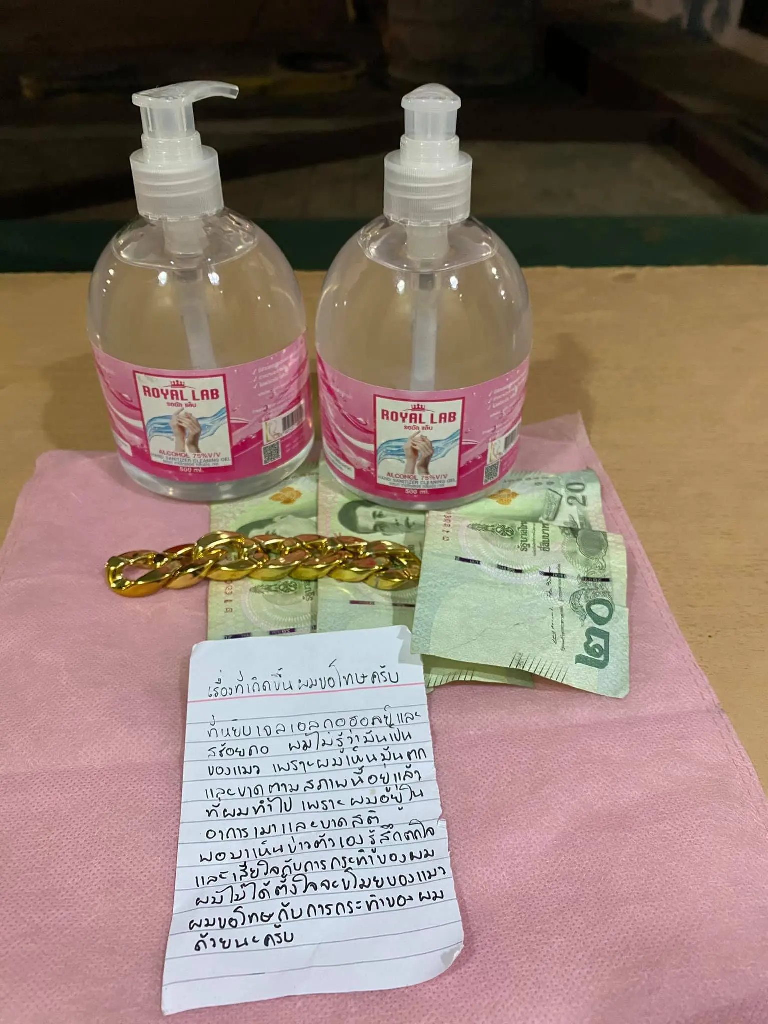 เสี่ยเก๋า แมวพันธุ์ไทยได้สร้อยคืน หลังถูกมือดีขโมยไปพร้อมเจลแอลกอฮอล์ ทิ้งจดหมายและเงิน 60 บาท สารภาพ ทำไปเพราะเมา