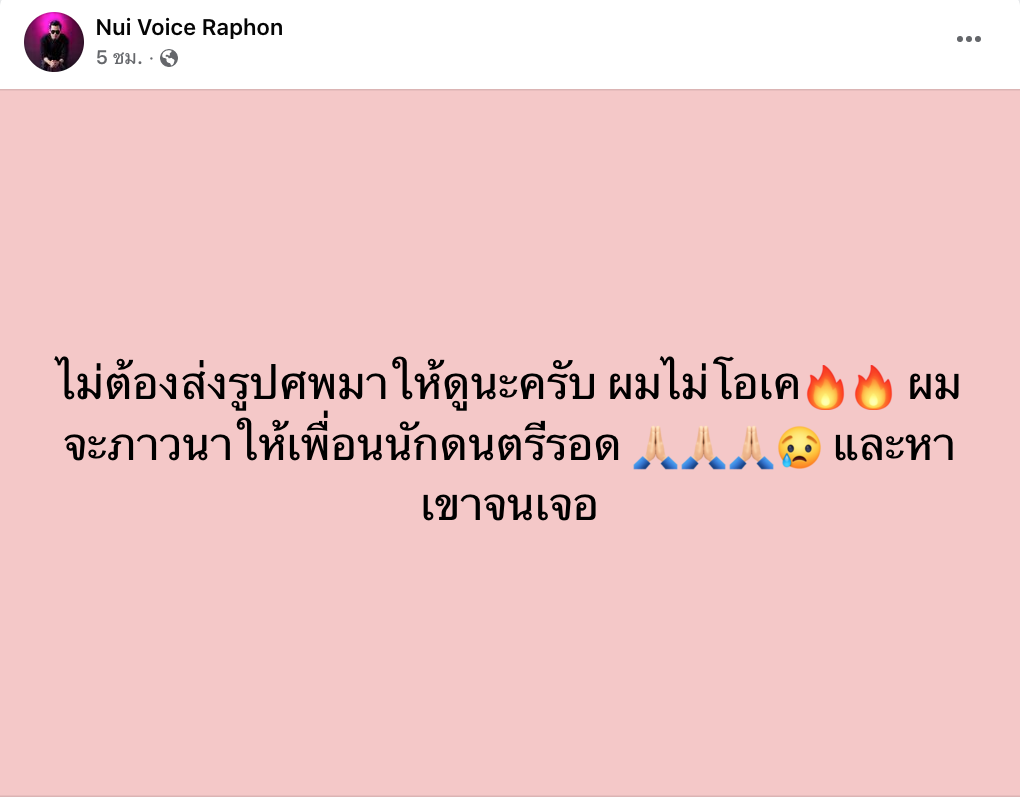 และยังได้โพสต์โดยระบุข้อความภายในโพสต์อีกว่า ไม่ต้องส่งรูปศพมาให้ดูนะครับ ผมไม่โอเค ผมจะภาวนาให้เพื่อนนักดนตรีรอด และหาเขาจนเจอ
