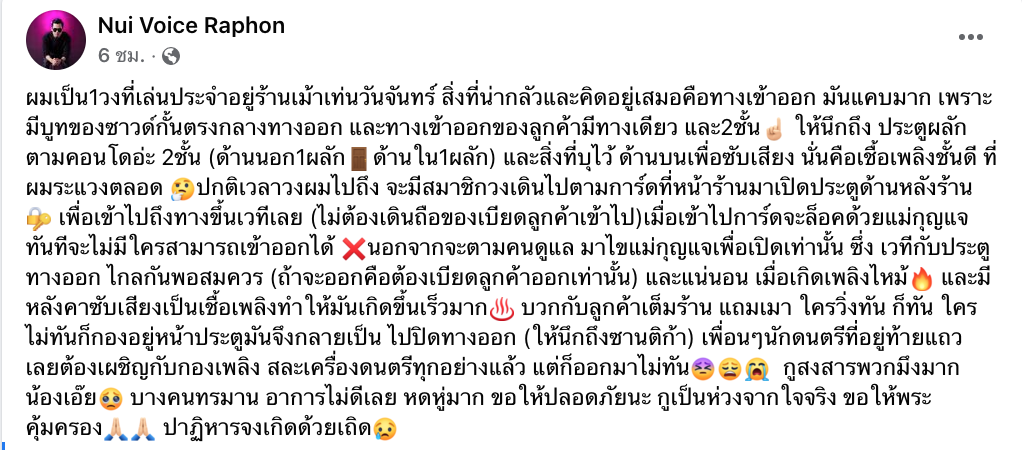 โดยล่าสุดผู้ใช้งานเฟซบุ๊กรายหนึ่งชื่อ Nui Voice Raphon เป็นนักร้องหนุ่ม ที่ร้องเพลงประจำวันจันทร์ วันเกิดเหตุจึงไม่ได้อยู่ในเหตุการณ์ โดยได้โพสต์ผ่านเฟซบุ๊กว่า ผมเป็น 1 วงที่เล่นประจำอยู่ร้านเมาท์เทนวันจันทร์ สิ่งที่น่ากลัวและคิดอยู่เสมอคือทางเข้าออก มันแคบมาก เพราะมีบูทของซาวด์กั้นตรงกลางทางออก และทางเข้าออกของลูกค้ามีทางเดียว และ 2 ชั้น ให้นึกถึง ประตูผลักตามคอนโดอ่ะ 2 ชั้น (ด้านนอก 1 ผลัก ด้านใน 1 ผลัก) และสิ่งที่บุไว้ ด้านบนเพื่อซับเสียง นั่นคือเชื้อเพลิงชั้นดี ที่ผมระแวงตลอด โดยได้ระบุข้อความภายในโพสต์ว่า