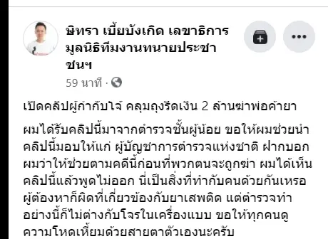 ทนายตั้ม หรือ ษิทรา เบี้ยบังเกิด เลขาธิการมูลนิธิทีมงานทนายประชาชนฯ โพสต์คลิปเหตุการณ์หนึ่งในเพจ “ษิทรา เบี้ยบังเกิด เลขาธิการมูลนิธิทีมงานทนายประชาชนฯ” พร้อมระบุข้อความว่า เปิดคลิปผู้กำกับ.. คลุมถุงรีดเงิน 2 ล้านฆ่าพ่อค้ายา
