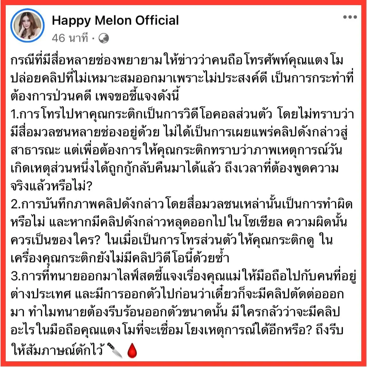 ซึ่งในการแถลงข่าวของ ทนายเดชา ได้ยืนยันแล้วว่า แม่แตงโม เป็นคนส่งโทรศัพท์มือถือของ แตงโม นิดา ไปให้ บังแจ็ค ไกลถึงประเทศสหรัฐอเมริกา โดยมีค่าส่งประมาณ 2,000 บาท ล่าสุดในวันเดียวกันนี้ ด้านเพจ Happy Melon official ก็ได้ออกมาชี้แจงบ้าง โดยมีข้อความดังนี้