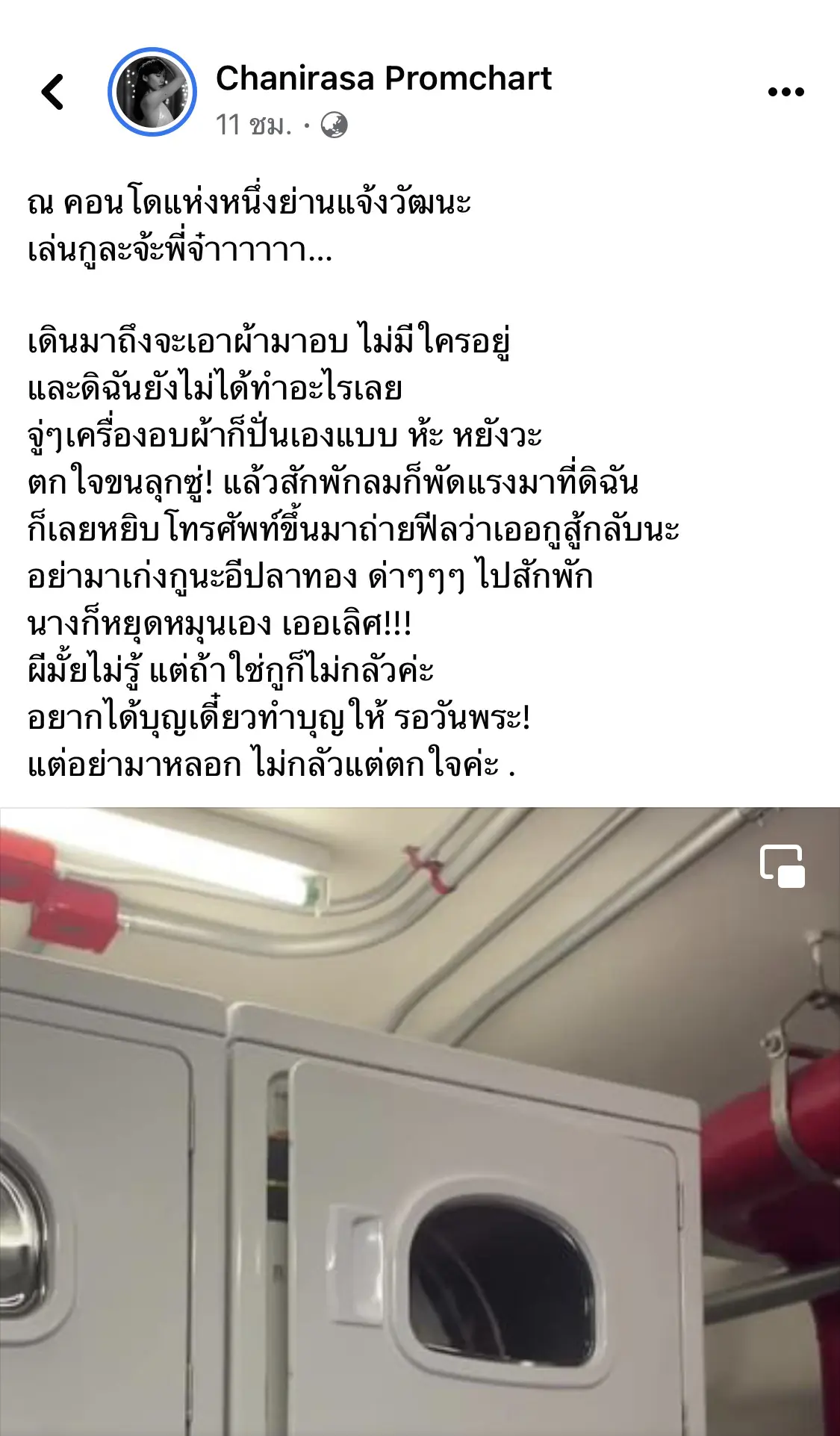 จนกระทั่งไปถึงยังห้องอบผ้าของคอนโด…ขณะที่กำลังจะเอาผ้าเข้าตู้อบ “จู่ๆตู้ด้านในสุดก็ปั่นเอง” และมีลมพัดแรงมาที่หน้า ซึ่งตรงนั้นไม่มีใครอยู่เลย มันแปลกมาก จึงตัดสินใจหยิบโทรศัพท์ขึ้นมาถ่ายไว้! หลังถ่ายเสร็จมันก็ยังไม่หยุดหมุน เลยลั่นออกไปว่า…