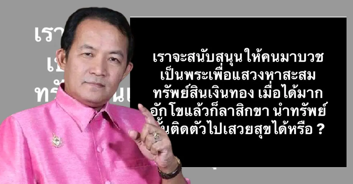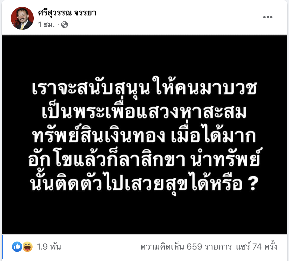พี่ศรียังไปต่อ เคลื่อนไหวต่อเนื่อง! พี่ศรี ศรีสุวรรณ โพสต์เชิงตั้งคำถาม จะสนับสนุนให้บวชเพื่อนำทรัพย์ไปเสวยสุขหรือ? หลังจากก่อนหน้านี้โพสต์ประเด็นทรัพย์สินของพส.