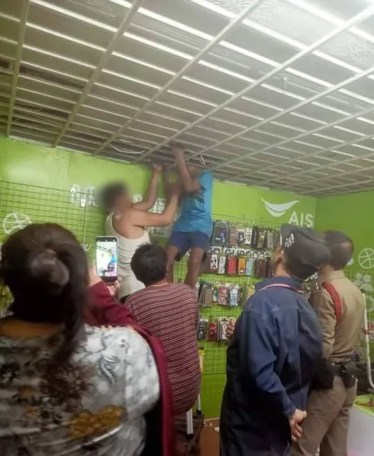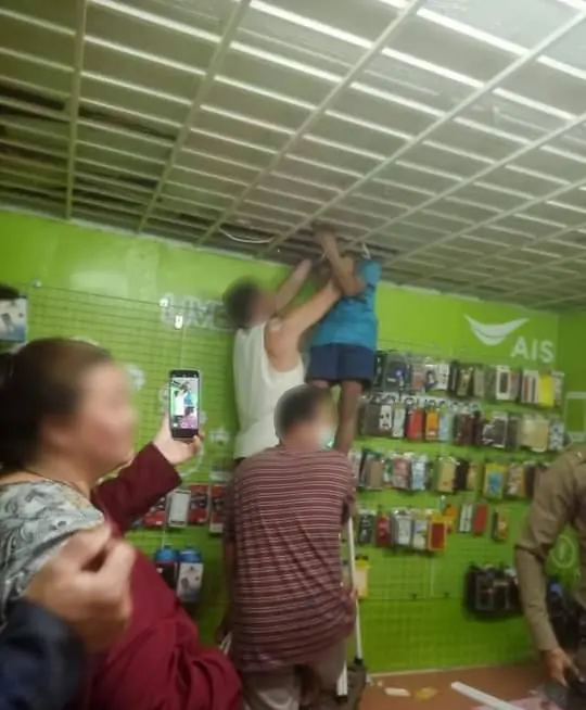 เมื่อ คุณรัตนาพร ผู้เป็นเจ้าของร้านมาถึงเปิดประตูเข้าไปจึงพบ เด็กชายรายหนึ่งติดอยู่บนเพดานที่ตนสร้างขึ้นมาเสริมกันขโมย โดยเด็กชายดังกล่าวมีอายุเพียงแค่ 14 ปี เมื่อตนสอบถามความเป็นมาจนทราบข้อมูลว่า “ผู้ก่อเหตุไม่ได้เข้ามาขโมยของ แค่เข้ามาเดินเล่น”