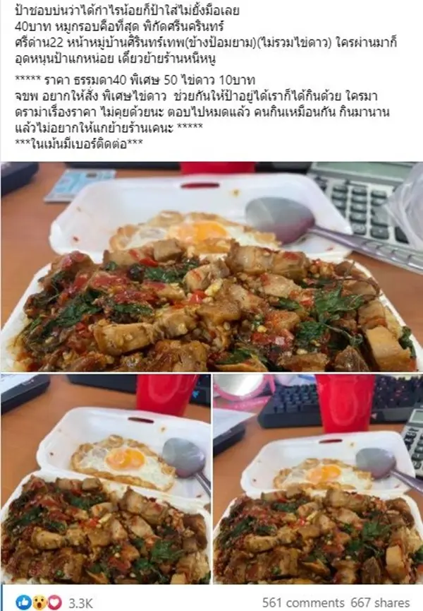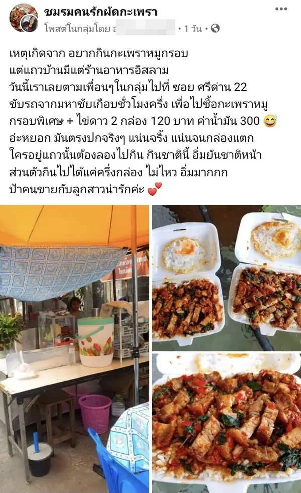 เมื่อกลุ่มเฟซบุ๊ก “ชมรมคนรักผัดกะเพรา” ได้มีผู้ใช้เฟซบุ๊ครายหนึ่งโพสต์ภาพพร้อมข้อความเมนู ผัดกะเพราหมูกรอบ ที่ได้ปริมาณเยอะมาก แต่ราคาสุดคุ้มสบายกระเป๋าเพียงแค่ 40 บาท โดยผู้โพสต์ได้มีการระบุข้อความว่า “ป้าชอบบ่นว่าได้กำไรน้อยก็ป้าใส่ไม่ยั้งมือเลย 40บาท หมูกรอบคือที่สุด พิกัดศรีนครินทร์ ศรีด่าน22 หน้าหมู่บ้านศิรินทร์เทพ(ข้างป้อมยาม)(ไม่รวมไข่ดาว) ใครผ่านมาก็อุดหนุนป้าแกหน่อย เดี๋ยวย้ายร้านหนีหนูราคา ธรรมดา40 พิเศษ 50 ไข่ดาว 10บาท อยากให้สั่ง พิเศษไข่ดาว ช่วยกันให้ป้าอยู่ได้เราก็ได้กินด้วย ใครมาดราม่าเรื่องราคา ไม่คุยด้วยนะ ตอบไปหมดแล้ว คนกินเหมือนกัน กินมานานแล้วไม่อยากให้แกย้ายร้านเคนะ”