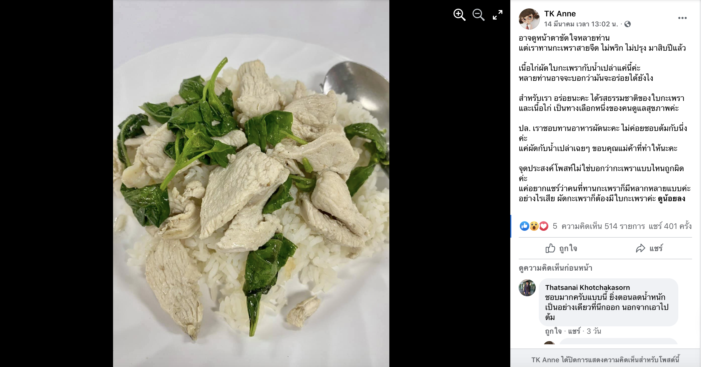 สายกะเพรามารวมกันตรงนี้ ช่วยบอกเราหน่อยว่ากะเพราของคุณมีหน้าตา และ รสชาติอย่างไร บางคนสายเผ็ดจัดแบบ ถึงตายก็ไม่เอาเรื่อง ผัดกะเพรา โคตรเผ็ด! ถ้าลูกค้าตายเป็นพยานให้ผมด้วย บางคนสายเน้นกะเพรา บางคนก็สายจืด อย่างเช่นผู้ใช้เฟสบุ๊ค อย่างคุณ TK Anne ที่ออกมาแชร์เรื่องราวของกะเพราสายจืด แบบ ไม่พริก ไม่ปรุง ทานแบบนี้มาแล้วร่วม 10ปี