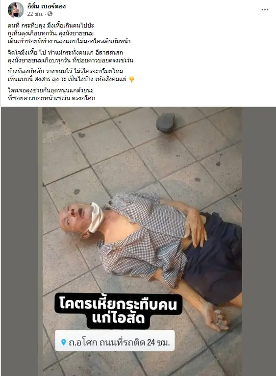 กระทืบคนแก่ เกิดกระแสดราม่าบนโลกออนไลน์ กรณีชายสูงวัยโดนทำร้ายร่างกายจนถึงกับลงไปนอน โดยเหตุการณ์เกิดขึ้นที่ บรเวณถนนอโศก กทม.