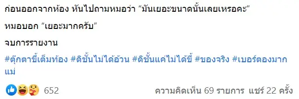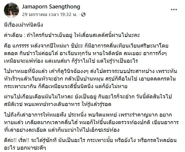 ล่าสุดเมื่อวันที่ 7 ก.พ. ที่ผ่านมา เธอได้มาอัพเดทอากาศอีกครั้ง และได้แชร์เรื่องราวลงไว้เป็นวิทยาทานให้แก่ผู้อ่าน โดยเธอระบุว่า “หลังจากที่หาหมอจนเจอว่าเป็นโรค (ขอเรียกว่าโรคละกัน) “ขี้เต็มท้อง” พอซัดยาหมอตามอาการเข้าไป วันรุ่งขึ้นเท่านั้น ที่ลอตแรกได้ถูกปลดปล่อย ดีขึ้นทันตาเห็น ใช่ละ กรูเป็นหละ สาเหตุนี้