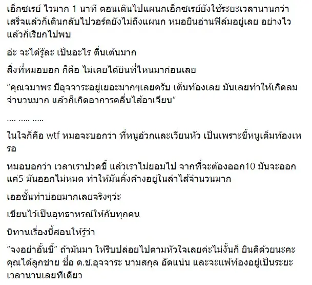โดยเธอก็ได้เตือนอีกว่า ไม่แนะนำเด็ดขาด ให้ทานยาถ่ายเองนะคะ เราเคยมาแล้ว ปรับแก้กันนานหลายปีมาก อันตรายสุดๆ อีกอย่าง เราไม่รู้ว่าขี้เรามันเยอะขนาดไหน หรือจริงๆมันคือโรคนี้ที่เราเป็นมั้ย บางทีกินยาถ่ายไป ออกไม่หมด ขี้ออกมาเองไม่ได้ เป็นหนักกว่าเดิม และไม่แนะนำเลยนะคะ ที่จะกินยาถ่ายเพื่อให้พุงที่เราคิดว่ามันเป็นขี้มันยุบลงไป นอกจากมีอาการแบบที่เคยเขียนไว้เท่านั้น