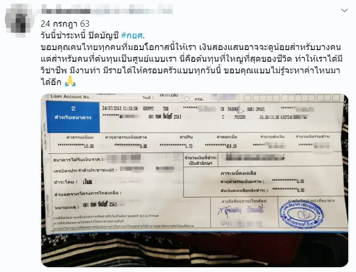 โดยผู้ใช้ทวิตเตอร์ดังกล่าวระบุว่า 24 กรกฎา 63 วันนี้ชำระหนี้ ปิดบัญชี กยศ. ขอบคุณคนไทยทุกคนที่มอบโอกาสนี้ให้เรา เงินสองแสนอาจจะดูน้อยสำหรับบางคน แต่สำหรับคนที่ต้นทุนเป็นศูนย์แบบเรา นี่คือต้นทุนที่ใหญ่ที่สุดของชีวิต ทำให้เราได้มีวิชาชีพ มีงานทำ มีรายได้ให้ครอบครัวแบบทุกวันนี้ ขอบคุณแบบไม่รู้จะหาคำไหนมาได้อีก