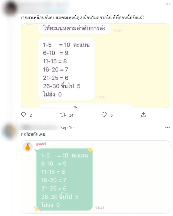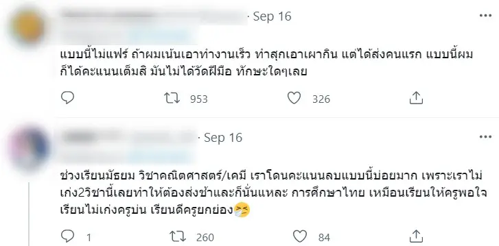 วานนี้ (16 ก.ย.) ได้มีผู้ใช้ทวิตเตอร์รายหนึ่ง ออกมาโพสต์เกี่ยวกับวิธีการให้คะแนนของครูในโรงเรียน ที่จะให้คะแนนแบบคนที่ส่งคนแรกถึงคนที่ 10 จะได้คะแนนเต็ม (10 คะแนน) ส่งคนที่ 11-20 จะได้คะแนน 9 คะแนน และส่งคนที่ 21 ถึงสุดท้าย จะได้คะแนนเพียงแค่ 8 เท่านั้น โดยเธอมองว่า มันควรเป็นการส่งงานแบบตั้งเดทไลน์ กำหนดวันส่งดีกว่ามาตั้งคะแนนแบบนี้