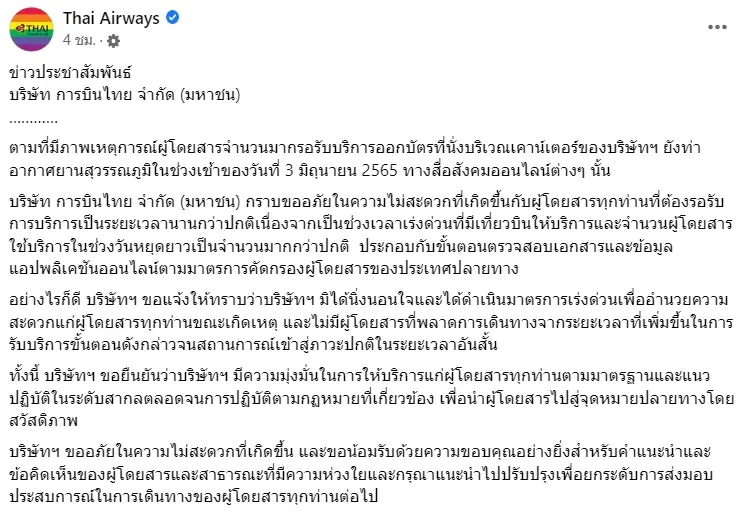 บริษัท การบินไทย จำกัด (มหาชน) กราบขออภัยในความไม่สะดวกที่เกิดขึ้นกับผู้โดยสารทุกท่านที่ต้องรอรับการบริการเป็นระยะเวลานานกว่าปกติเนื่องจากเป็นช่วงเวลาเร่งด่วนที่มีเที่ยวบินให้บริการและจำนวนผู้โดยสารใช้บริการในช่วงวันหยุดยาวเป็นจำนวนมากกว่าปกติ ประกอบกับขั้นตอนตรวจสอบเอกสารและข้อมูลแอปพลิเคชันออนไลน์ตามมาตรการคัดกรองผู้โดยสารของประเทศปลายทาง