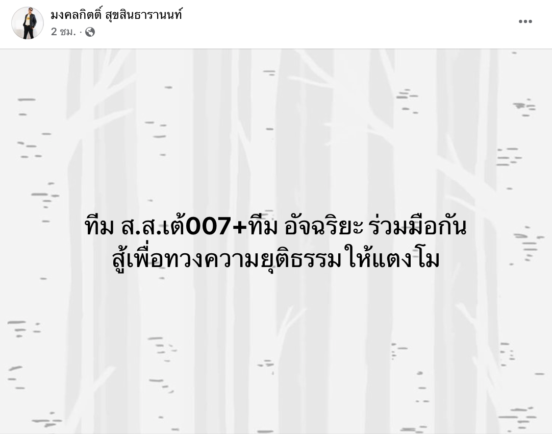 โดยล่าสุดออกมาโพสต์ ส.ส.เต้ มงคลกิตติ์ รวมทีมระหว่าง ทีมส.ส.เต้ มงคลกิตติ์007 กับ ทีมอัจฉริยะ เดินหน้าต่อสู้ คดีแตงโมตกเรือ