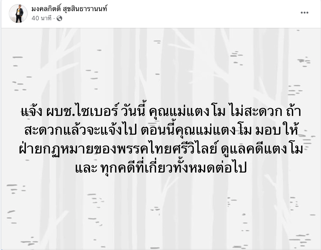 แจ้ง ผบช.ไซเบอร์ วันนี้ คุณแม่แตงโม ไม่สะดวก ถ้าสะดวกแล้วจะแจ้งไป ตอนนี้คุณแม่แตงโม มอบให้ ฝ่ายกฏหมายของพรรคไทยศรีวิไลย์ ดูแลคดีแตงโม และ ทุกคดีที่เกี่ยวทั้งหมดต่อไป