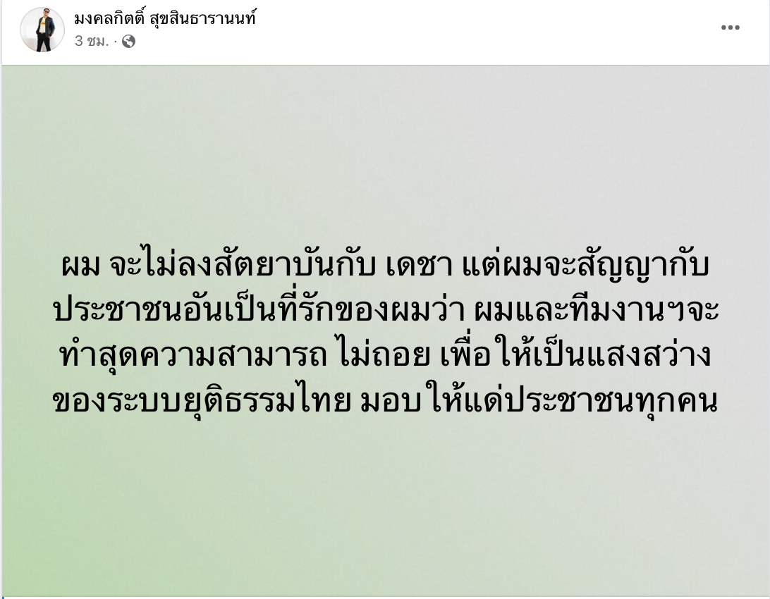 ผม จะไม่ลงสัตยาบันกับ เดชา แต่ผมจะสัญญากับประชาชนอันเป็นที่รักของผมว่า ผมและทีมงานฯจะทำสุดความสามารถ ไม่ถอย เพื่อให้เป็นแสงสว่างของระบบยุติธรรมไทย มอบให้แด่ประชาชนทุกคน