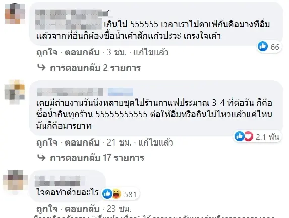 หลังจากที่โพสต์ข้องเจ้าของร้านถูกเผยแพร่ออกไปก็มีชาวเน็ตมากมายเข้ามาร่วมแสดงความคิดเห็นโดยบางรายระบุว่า ถ้าเป็นเราจะถ่ายขนาดนั้นต่ำๆก็ต้องมี 4-5 แก้ว กินหมดไม่หมดไม่รู้ รู้แค่ว่ามีตังจ่ายและช่วยอุดหนุนเจ้าของร้านไป ก็วินๆ , แย่นะคนแบบนี้อย่างน้อยๆเราก็ช่วยอุดหนุนน้ำที่ร้านเขาก็ยังดีบางทีน่ะซื้อก็ไม่ใช่ได้หิวน้ำอะไรนะถ่ายรูปตั้งจนละลายก้อมี แต่ถ้าให้เข้าร้านคาเฟ่แล้วไม่ซื้อน้ำหรือซื้ออะไรเลยบอกตรงๆเลยว่าส่วนตัวอายและเขินมาก