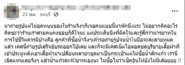 ซึ่งเจ้าของร้านดังกล่าวได้ออกมาโพสต์ตัดพ้อผ่านเฟซบุ๊กส่วนตัวโดยเธอได้ระบุข้อความเอาไว้ว่า “มาถ่ายรูปแต่ไม่อุดหนุนของในร้านจิงๆก็เจอคนแบบนี้มาพักนึงแระ ไม่อยากคิดอะไรคิดซะว่าร้านเราสวยคนคงชอบก็ดีใจนะ แต่ประเด็นนึงที่ติดใจและรู้สึกว่ามารยาทในการใช้ชีวิตควรมีบ้างคือ ลูกค้าที่ซื้อน้ำจิงๆเค้ารอถ่ายรูปจนน้ำในมือจะละลายหมดแล้ว เคสนี้ถ่ายรูปเสร็จขับรถออกไปเลย และก็จะมีเคสเน็ตไอดอลชลบุรีขายเสื้อผ้าที่เข้าประตูหลังเอาเสื้อผ้ามาเปลี่ยนหลายๆชุดมาเป็นกระเป๋าแต่ไม่ซื้อน้ำสักแก้ว เรานี่เขิลแทนเลยจิงๆ แล้วน้ำแก้วละ40บาทเองนะ ไม่ซื้อไม่ว่าเช็คอินให้ยังไม่มีเล๊ยยยย !!”