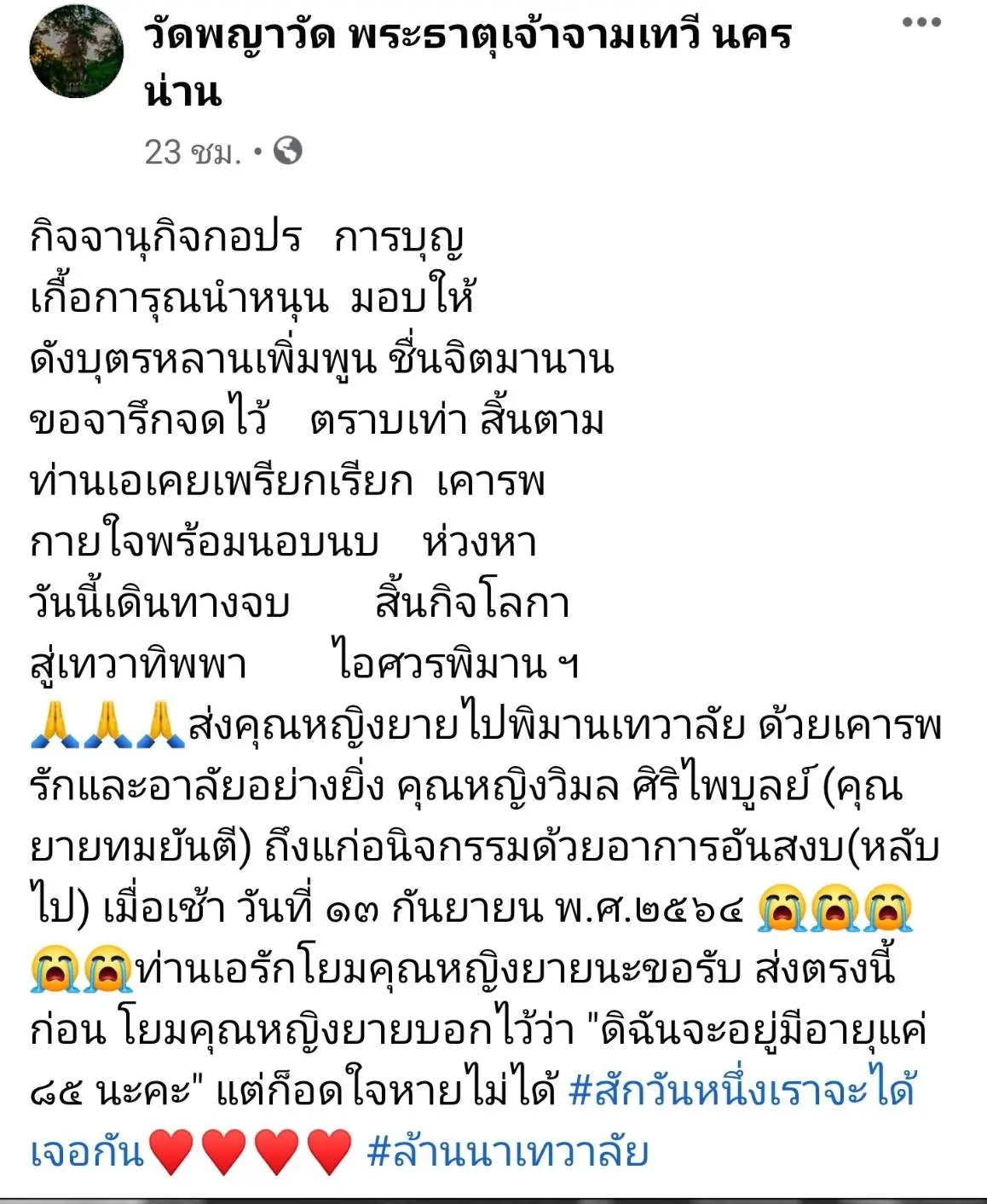 กิจจานุกิจกอปร การบุญ เกื้อการุณนำหนุน มอบให้ ดังบุตรหลานเพิ่มพูน ชื่นจิตมานาน ขอจารึกจดไว้ ตราบเท่า สิ้นตาม ท่านเอเคยเพรียกเรียก เคารพ กายใจพร้อมนอบนบ ห่วงหา วันนี้เดินทางจบ สิ้นกิจโลกา สู่เทวาทิพพา ไอศวรพิมาน ฯ ส่งคุณหญิงยายไปพิมานเทวาลัย ด้วยเคารพรักและอาลัยอย่างยิ่ง คุณหญิงวิมล ศิริไพบูลย์ (คุณยายทมยันตี) ถึงแก่อนิจกรรมด้วยอาการอันสงบ(หลับไป) เมื่อเช้า วันที่ ๑๓ กันยายน พ.ศ.๒๕๖๔ ท่านเอรักโยมคุณหญิงยายนะขอรับ ส่งตรงนี้ก่อน โยมคุณหญิงยายบอกไว้ว่า “ดิฉันจะอยู่มีอายุแค่ ๘๕ นะคะ” แต่ก็อดใจหายไม่ได้ สักวันหนึ่งเราจะได้เจอกัน ล้านนาเทวาลัย