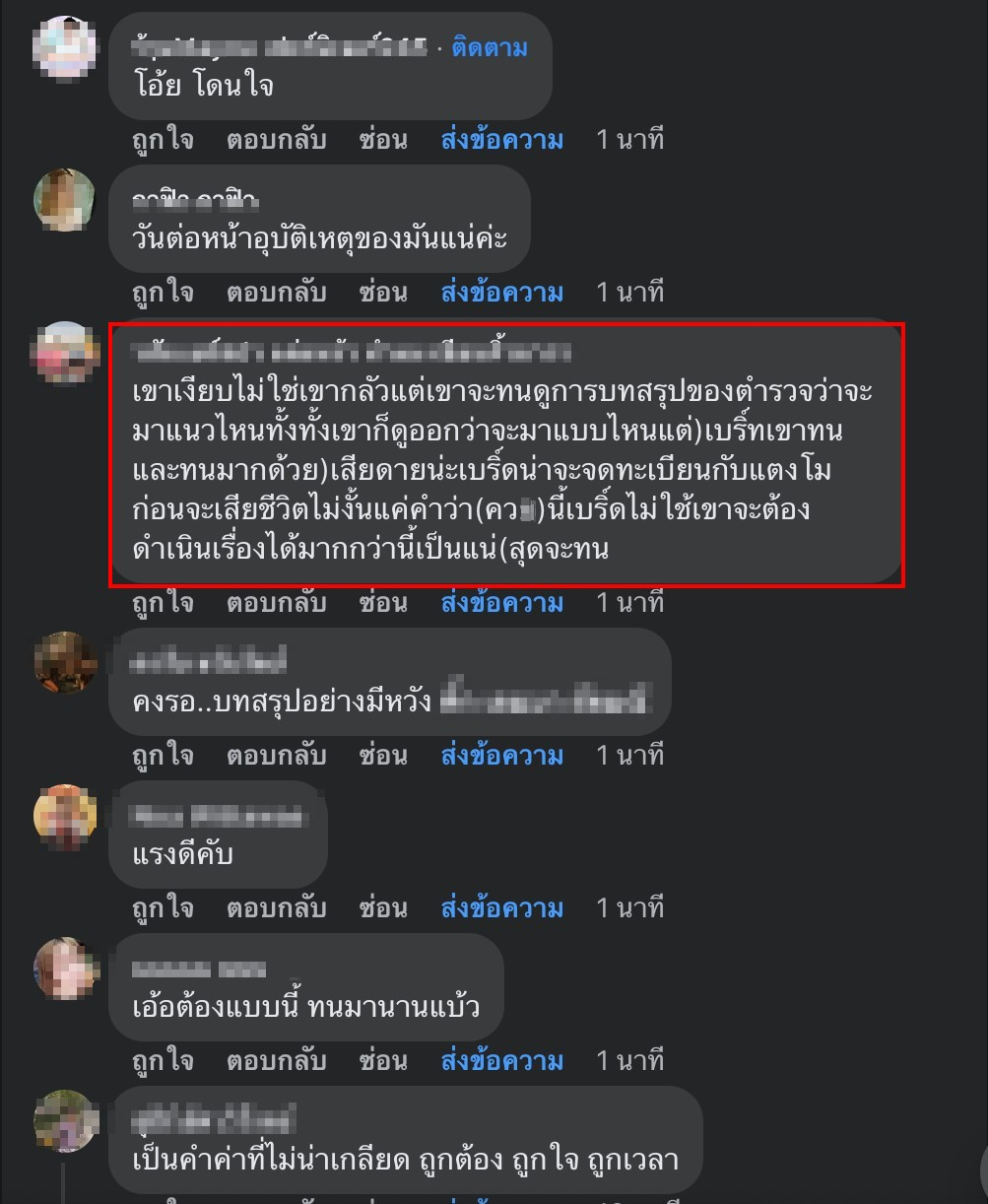 งานนี้ทำเอาชาวเน็ตแห่เข้าไปคอมเมนต์แสดงความคิดเห็นพร้อมทั้งให้กำลังใจ เบิร์ดแฟนแตงโม เป็นจำนวนมากโดยแต่ละคอมเมนต์ก็พร้อมใจกันบอกว่า “เบิร์ดคงทนมามากแล้วจริงๆ , เขาเงียบไม่ใช่เขากลัวแต่เขาจะทนดูการบทสรุปของตำรวจว่าจะมาแนวไหนทั้งทั้งเขาก็ดูออกว่าจะมาแบบไหนแต่)เบริ์ทเขาทนและทนมากด้วย)เสียดายน่ะเบริ์ดน่าจะจดทะเบียนกับแตงโมก่อนจะเสียชีวิตไม่งั้นแค่คำว่า(ควx)นี้เบิร์ดไม่ใช้เขาจะต้องดำเนินเรื่องได้มากกว่านี้เป็นแน่(สุดจะทน”