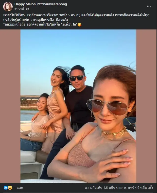 และอีกภาพนึงที่โพสต์ห่างกันเพียงไม่กี่ชั่วโมง ก็คือ ภาพแตงโมที่ถ่ายเซลฟี่ พร้อมด้วยแซน กระติก และปอ ขณะที่กำลังนั่งอยู่บนเรือ พร้อมระบุข้อความปริศนาว่า
