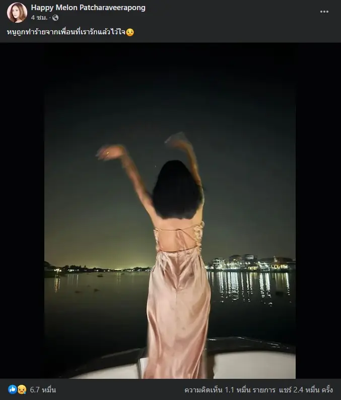 โดยโพสต์แรกที่เกิดขึ้นในเฟซบุ๊กของ แตงโม นิดา นั้น คือ ภาพผู้หญิงยืนหันหลัง ทำท่าทางโบกมืออยู่บนเรือกลางแม่น้ำ และระบุข้อความว่า “หนูถูกทำร้ายจากเพื่อนที่เรารักแล้วไว้ใจ😒”