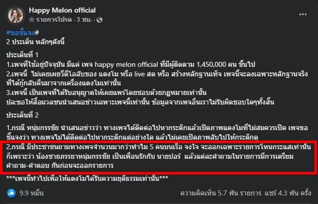 ซึ่งในช่วงเช้าของวันนี้ (24 พ.ค. 65) ในเฟซบุ๊ก Happy Melon official ได้มีการเคลื่อนไหวอีกครั้ง โดยเป็นการโพสต์ข้อความชี้แจง 2 ประเด็นหลัก ที่กำลังเป็นกระแสอยู่ในตอนนี้ ซึ่ง 1 ใน 2 ประเด็นที่ มือโพสต์ แตงโม ชี้แจงนั้น มีการอ้างถึง 5 คนบนเรือ และ หนุ่ม กรรชัย รวมถึงรายการโหนกระแส ด้วย ระบุว่า