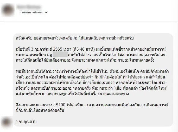อย่างกรณีนี้ เพจเพซบุ๊ก JS100 Radio ได้โพสต์รายงานว่ามีผู้โดยสารท่านหนึ่งเข้ามาร้องเรียนกับทางเพจ เล่าว่าเมื่อวันที่ 3 ก.พ. 65 เวลาประมาณ 04.00 น. ได้ใช้บริการแท็กซี่จากบริเวณสามย่าน เมื่อขึ้นรถผู้ขับเริ่มสนทนาถึงเรื่องห้องน้ำว่าเส้นทางดังกล่าวมีปั๊มหรือห้องน้ำให้เข้าบ้างไหม พร้อมทั้งเล่าถึงเหตุผลว่าตนเองเป็นโรคไต ไม่สามารถอุจจาระเองได้ จึงขอให้ผู้โดยสารช่วยตดให้ดมเพื่อตัวเองจะได้ถ่ายได้